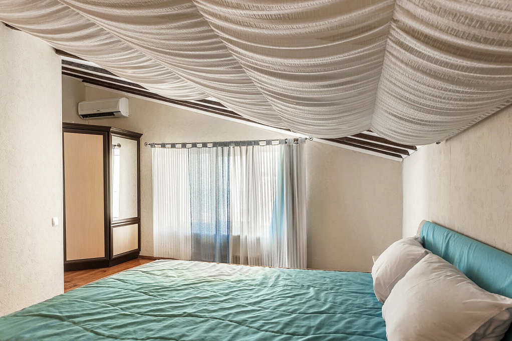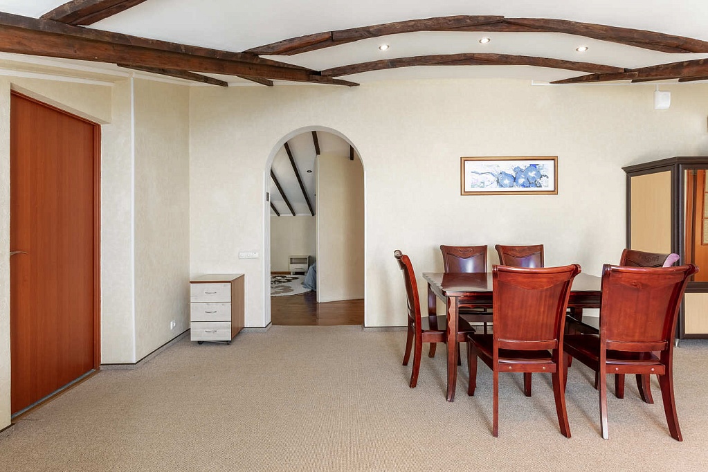 - Мебель: вешалка, диван, зеркало, кровать двуспальная, прикроватные тумбочки, стол, стулья, шкаф