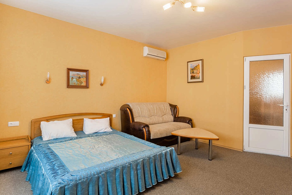 | Люкс 2-местный 1-комнатный | 28 кв.м. | 2 чел. | Балкон (с мебелью), Мебель (вешалка, диван, зеркало, кровать двуспальная, прикроватные тумбочки, сто... | |